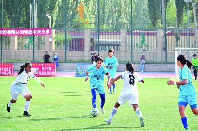 “石榴花开 青春绽放”全国青少年女子足球民族团结友谊赛赛场。光明图片